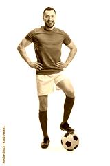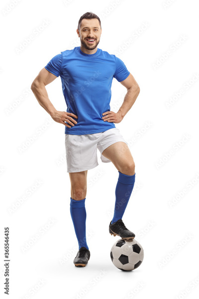 Full length portrait of a cheerful soccer player posing with a ball
