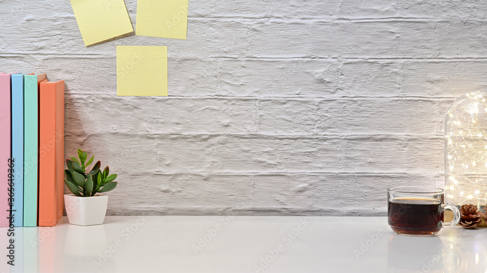 Cropped shot view of workspace with coffee cup, book and light bulb on white brick wall. Front view.