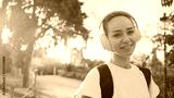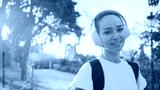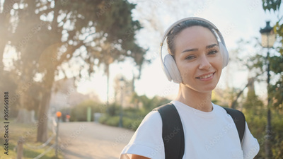 Portrait of beautiful girl in headphones with backpack smiling on camera on the way to morning training in city park