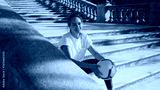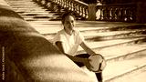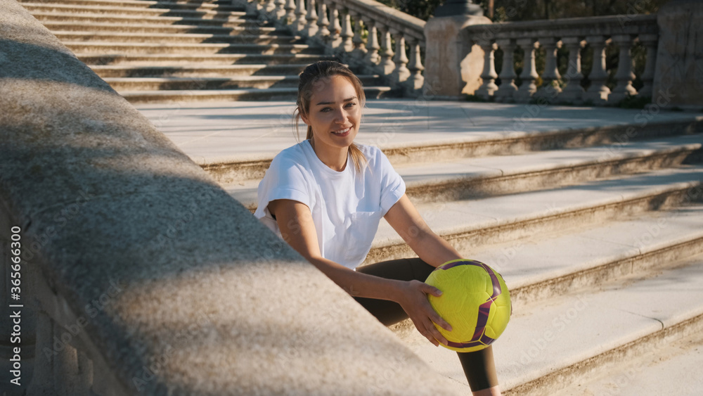 Beautiful sporty girl with football happily looking in camera resting on old stairs in park