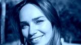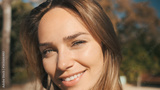 Close up charming girl sensually looking in camera outdoor. Beautiful smiling girl happily posing on street