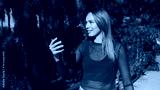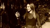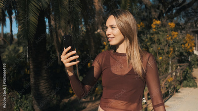 Pretty girl talking with family on video chat during walking along beautiful park. Attractive girl using phone outdoor