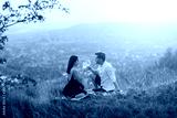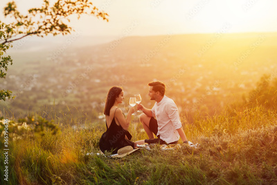 Couple in love on a white plaid take a picnic against the backdrop of a sunset in the mountains. Romantic time. Beautiful couple is enjoying picnic time at sunset. Copy space.