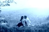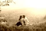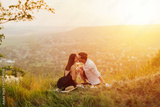 Young couple having a picnic at the hill. Man is kissing his girlfriend. Sunset over mountain in the background. Romance, dating and love concept. Romantic love story.