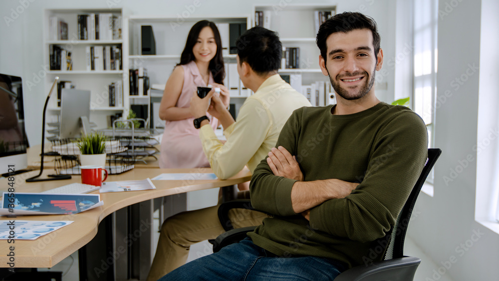 portrait of young male employee in casual clothes sitting in the office. Group of people talking and working behind.