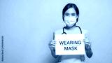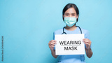 Asian, Thai doctor woman holding card with words WEARING MASK and stethoscope isolated on blue color background