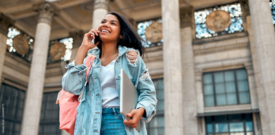 Cute african american girl student talking on the phone with a backpack and laptop near the campus.