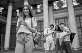A charming girl student with a backpack uses a smartphone against the background of a group of students near the campus.