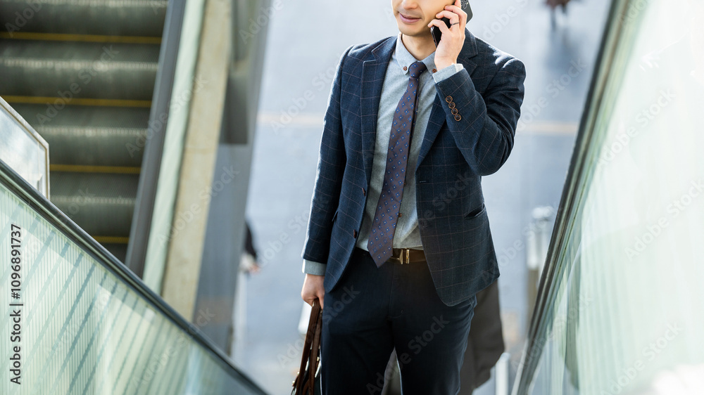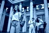 A charming girl student with a backpack talks on a smartphone against the background of a group of students near the campus.