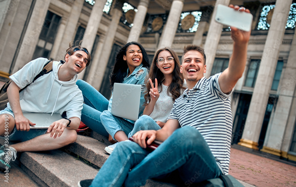 A group of students are sitting on the steps near the campus with laptops, relaxing, chatting and taking selfies on a smartphone.