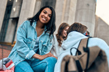 Attractive African American girl student sits on the steps near the campus with her friends.