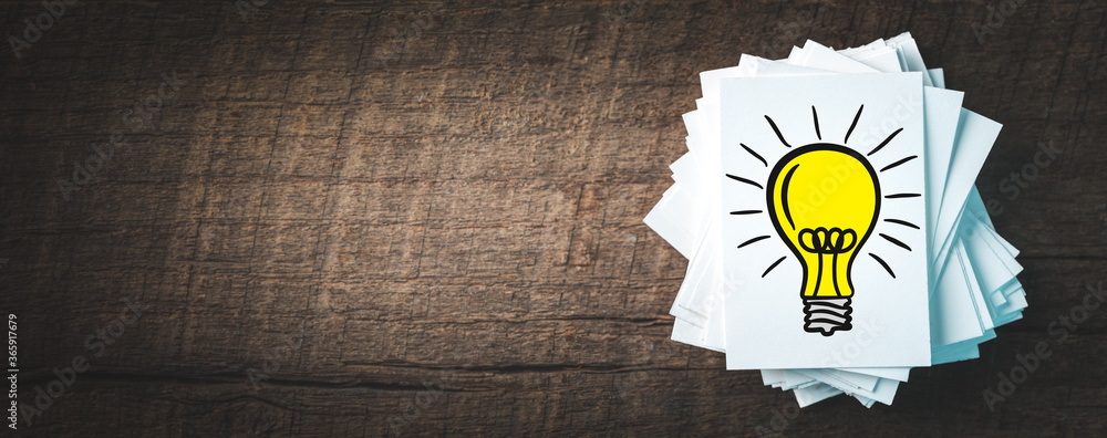Stack Of Papers With Light-bulb Symbols On Wooden Table - Ideas / Solutions Concept