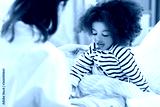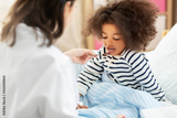 healthcare, medicine and people concept - doctor giving cough syrup to little sick african american girl in bed at home