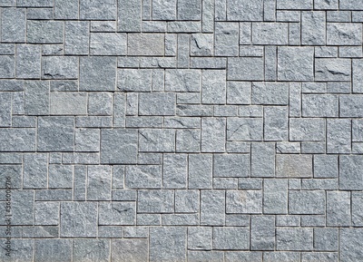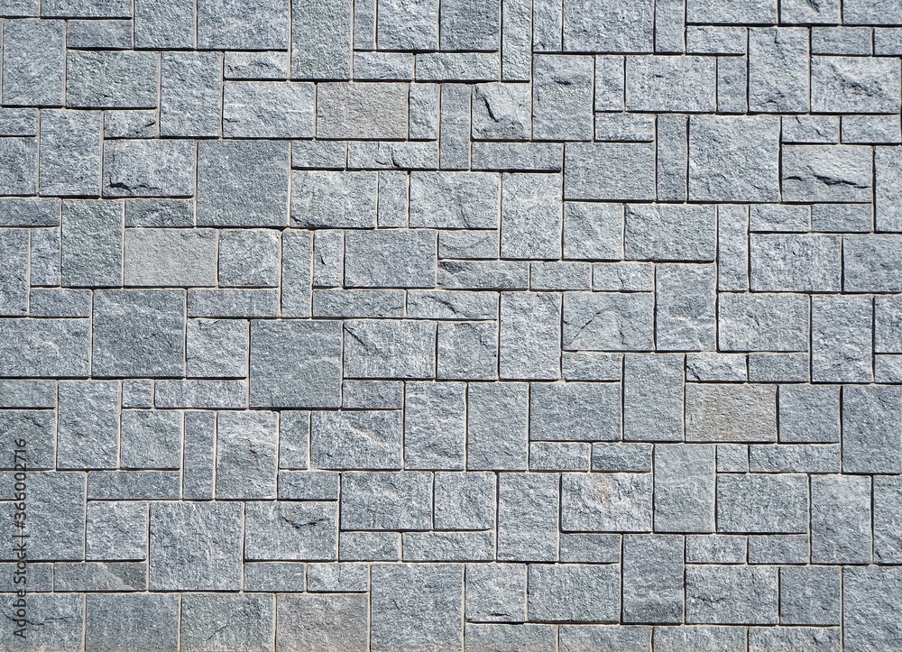 Stone wall with gray stone tiles of different dimensions and shape arranged geometrically. Background and texture