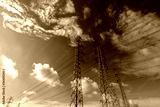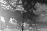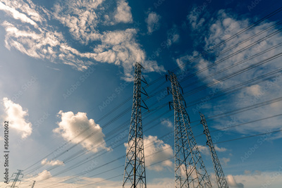 High voltage electric pylon and electrical wire against blue sky and white clouds. Bottom view of Electricity pylon with sunlight. High voltage grid tower with wire cable. Power and energy concept.