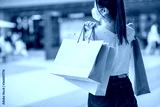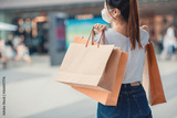 Shopping during quarantine conception, Happy woman wearing protective mask while holding paper bags.