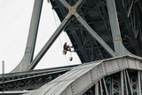 Painter working on the Porto Bridge. A worker repairs the Porto bridge hanging by ropes