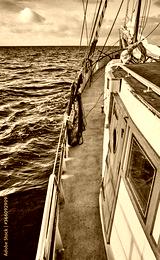 Side of an old sailing schooner at sunset, color toning applied.