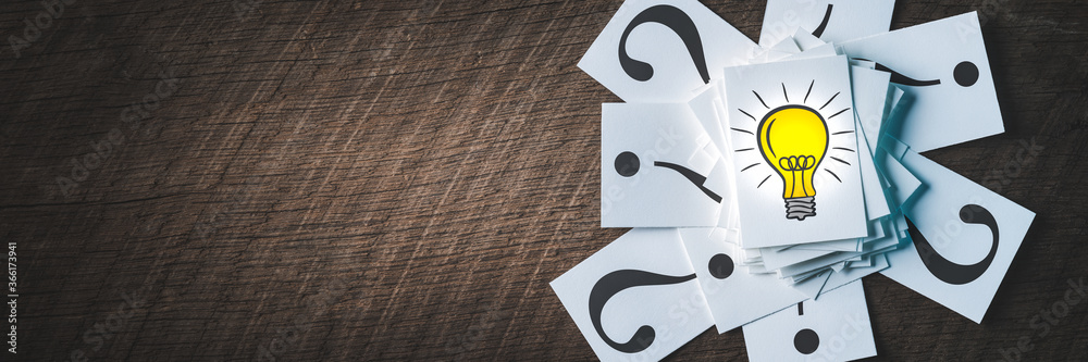 Stack Of Papers With Question Marks And Light-bulb Symbols On Wooden Table - Finding Solutions Concept