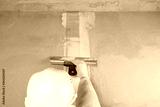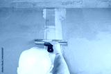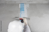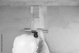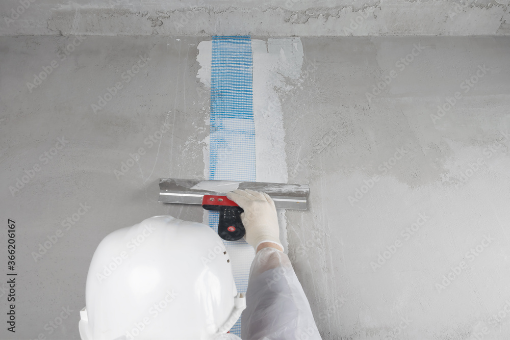 a repairman in a white helmet applies mortar with a spatula to the mesh glued to the seam on the wall, rear view, close-up