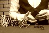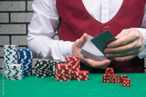 poker game concept: the croupier deals the cards, playing chips are laid out on the green cloth