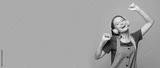 Young woman listening to music with headphones on pink background, space for text. Banner design