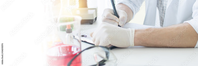 Laboratory Scientists in a Coverall Conducting Research. Chemist or doctor research and test Antiretroviral drugs and find information on laptop , how to resolve coronavirus or covid 19