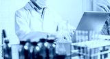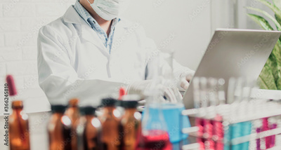 Laboratory Scientists in a Coverall Conducting Research. Chemist or doctor research and test Antiretroviral drugs and find information on laptop , how to resolve coronavirus or covid 19