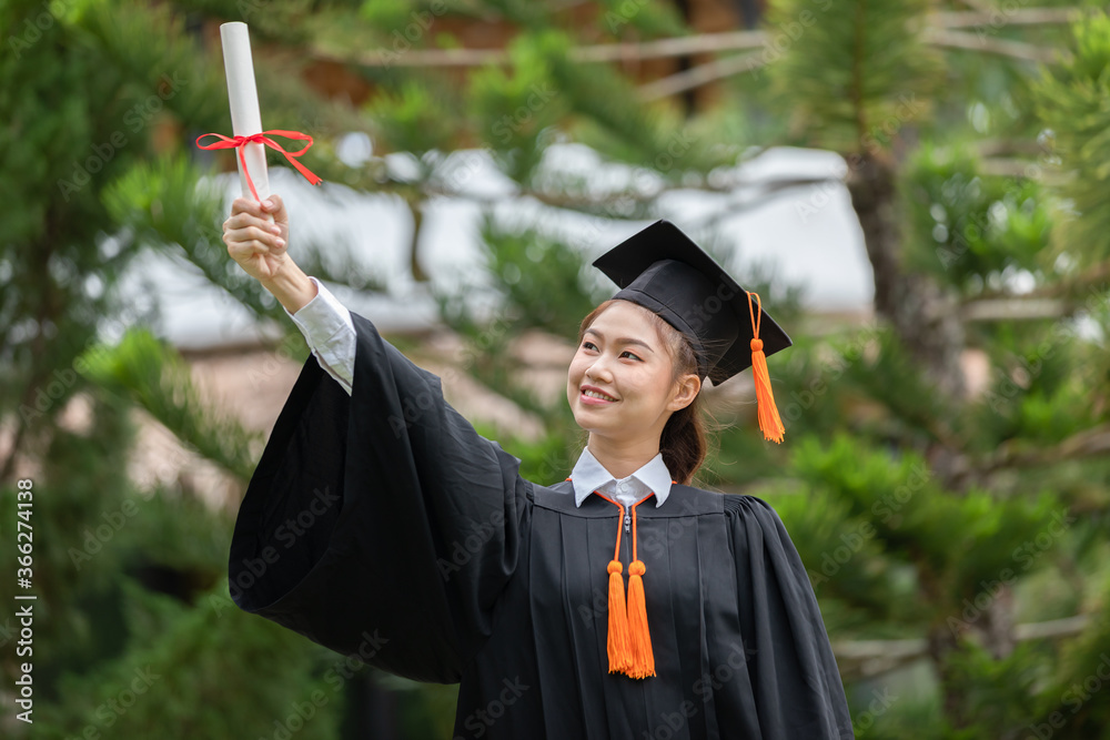 Attractive Asian Women Student Graduate in cap and gown celebrating
