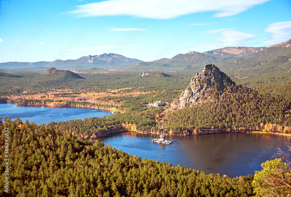 Majestic nature of Kazakhstan concept: epic view of Burabay lake with Zhumbaktas rock at sunrise in autumn season