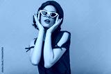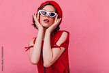 Glamorous french lady touching her sunglasses during indoor photoshoot. Studio shot of magnificent white woman with short wavy hair.