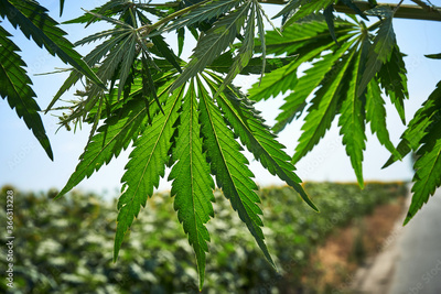 Green leaf of cannabis, background image. Thematic photos of hemp and marijuana