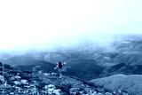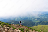 The girl stands on top of the mountain and enjoys the view of the valley. At the dawn, hands up