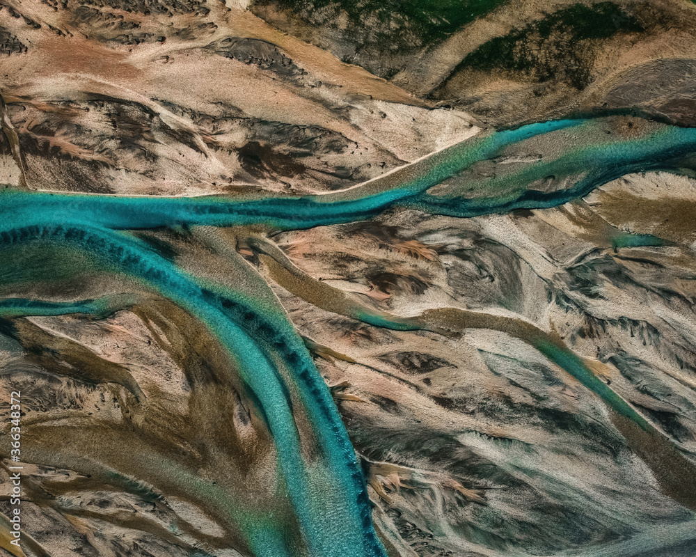 Aerial drone view of melting glacier river water in South Iceland. Abstract nature background