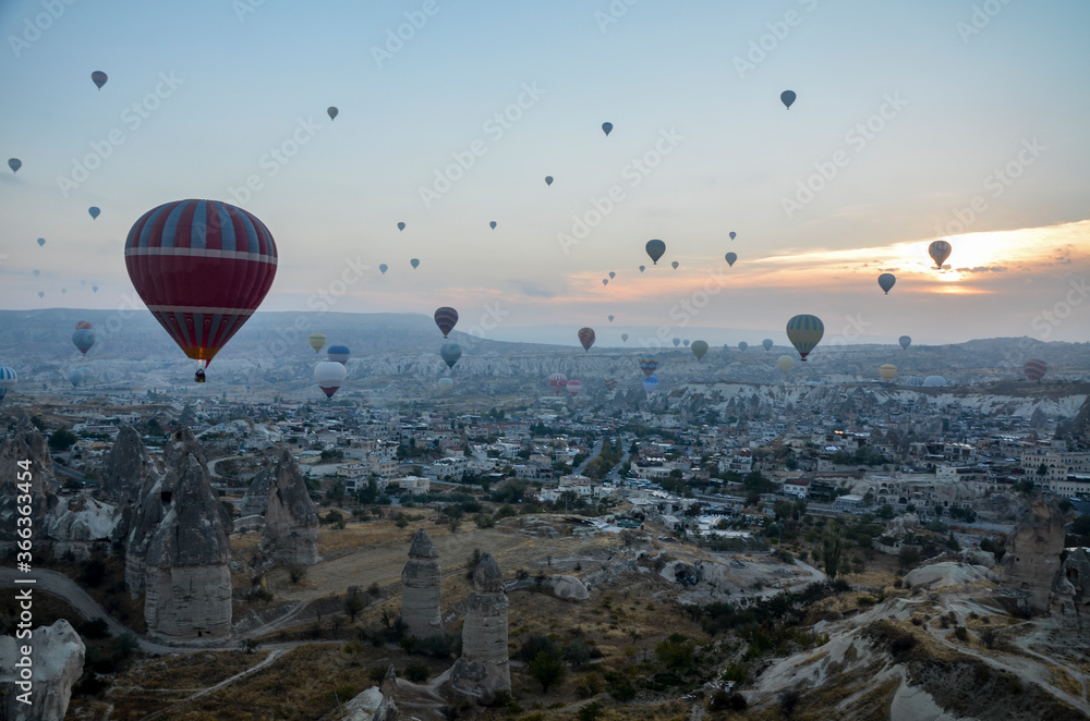 Colorful Hot air balloon flying over rocks and valley landscape at Cappadocia near Goreme Turkey
