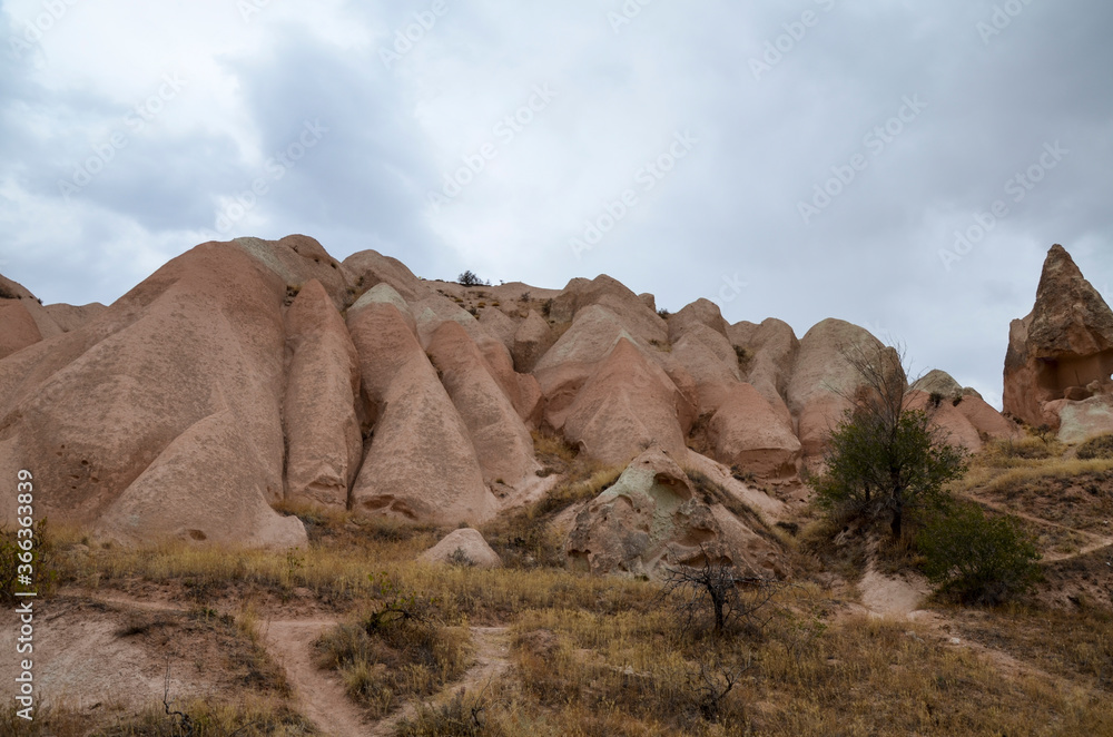 Unique limestone pyramids with beautiful old rock formations in Cappadocia, Goreme, Turkey