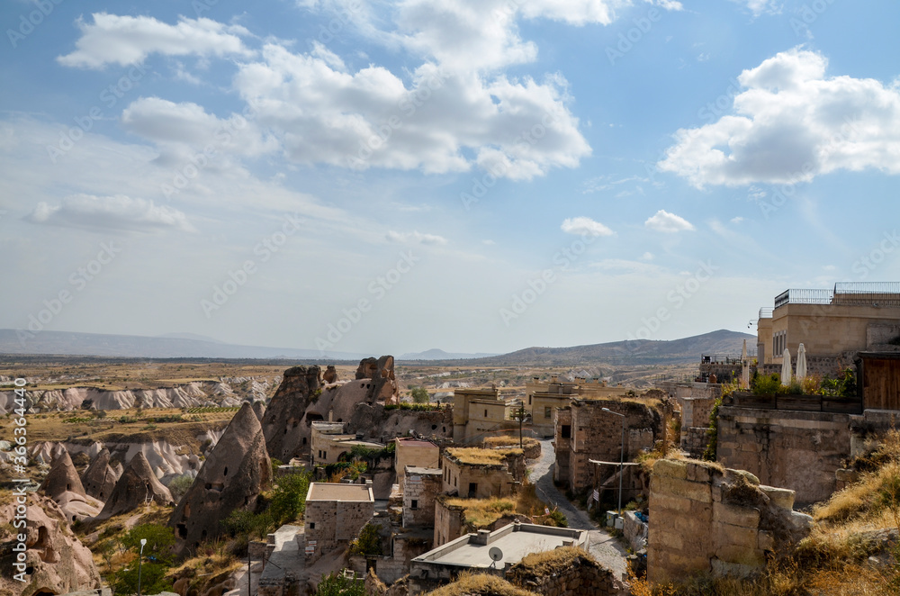 Amazing view to the cave town Uchisar from the ancient mountain fortress. Cappadocia, Turkey.