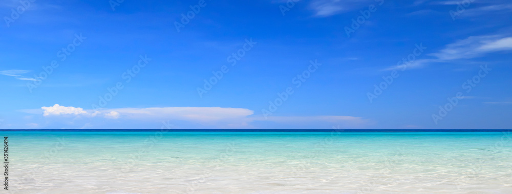 Closeup surface of calm ocean blue sea water with sunshine and clouds behind. Abstract Background Texture.