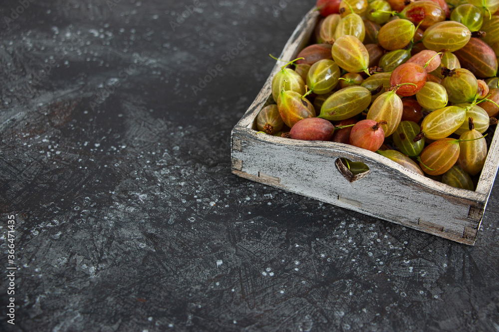 Wooden box with ripe gooseberries on a dark background close-up. Healthy food and harvest concept.