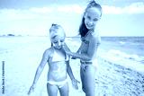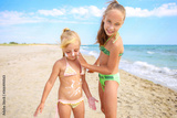 Sister applying protective sunscreen on young child. Girl draws sun cream on her stomach.