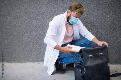 young doctor in the field, a doctor taking medical supplies out of a bag.
