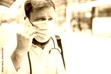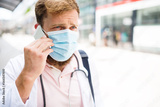 portrait of a young doctor with a mask on his face talking on a mobile phone
