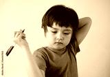 Portrait Kid boy holding black pen sitting alone and looking down with bored face ,Lonely child looking d down at table with sad face,Five years old kid bored with school homework,spoiled child