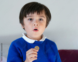 Portrait school kid showing one pound coin on his hand with proud face after back from school, Child boy wearing school uniform holding money coin, Child learning about saving concept