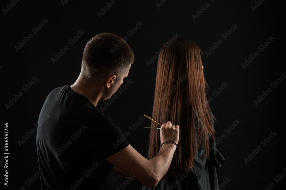 Beautiful young hairdresser doing hairstyle to female client in beauty salon