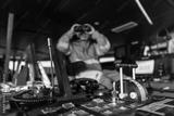 Filipino deck Officer on bridge of vessel or ship wearing coverall. He is looking through binoculars. COLREG navigaton watch at sea