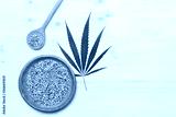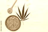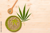 Green cannabis leaf and seeds on plate on wooden background. Vegetarian food concept