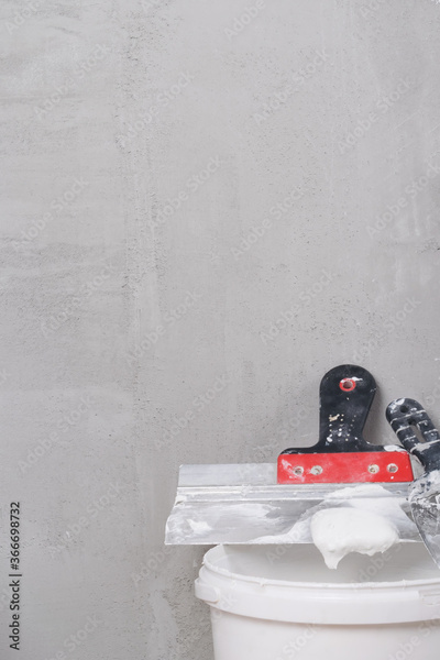 a bucket and a spatula with mortar on the background of a gray wall, top place for an inscription