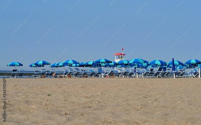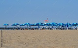 Beach resort with blue open parasols and sun beds. No people, empty shore.