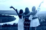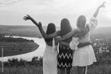 The back of three girls hugging together on the mountain. Happiness and togetherness concept. Beautiful summer evening. View from the back. Concept of freedom, rest and relaxation.